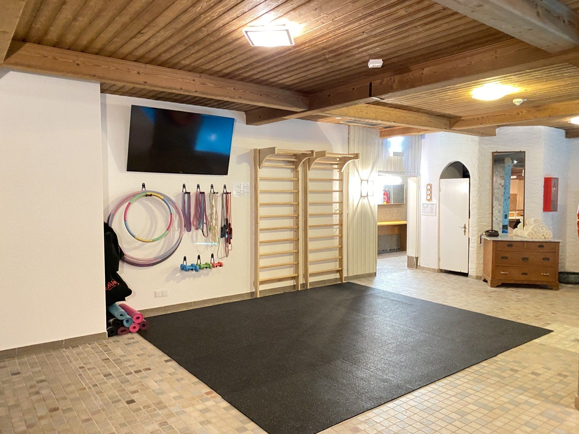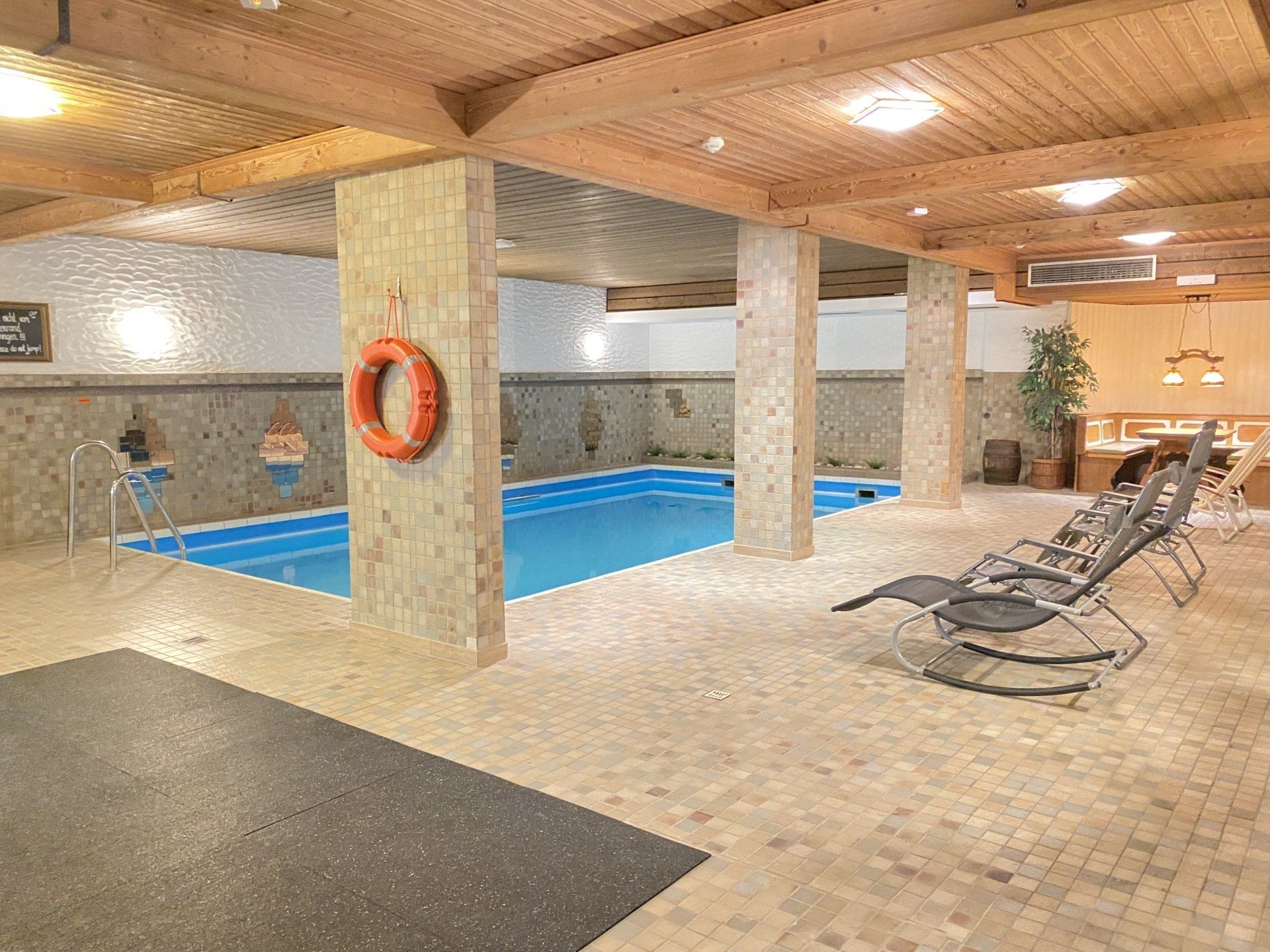 Von unseren Zimmern aus können Sie direkt und bequem über den Aufzug in den Pool- und Saunabereich gelangen. Es erwartet Sie ein 9 x 5 Meter großes Schwimmbecken, eine Sauna für max. acht Personen sowie ein Fitness-Eck mit zwei Sprossenwänden, Springseilen, Hanteln, Faszien-Rollen-Sets, Gymnastikbälle, Dehnungsbändern und Matten.